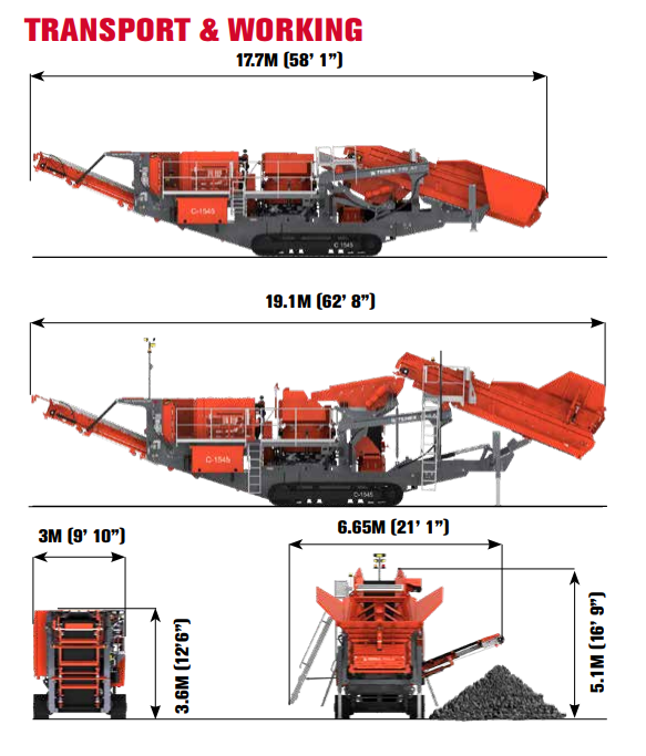 Terex® Finlay C-1545P je opremljen z drobilnikom Terex 1150, ki je gnan z direktno pogonsko sklopko s spremenljivo hitrostjo, s samodejnim odvzemom gonilne sile in raznimi hidravličnimi nastavitvami. Naprava ima vgrajen presejevalnik na prednjem delu, velikosti 2,1 mx 1,52 m, za odstranjevanje ali obvod posamičnega materiala. Material se lahko odvaja iz stroja z uporabo opcijskega transporterja na vozilu ali ponovno vnese na glavni transportni trak. Obe metodi izboljšata celotno pretočno kapaciteto, fleksibilnost izdelkov in zmanjšata obrabo samega stroja. V aplikacijah, pri katerih predhodni pregled materiala ni potreben, se modul lahko hidravlično premakne pod koš. To zagotavlja bolj kompaktno delovno celikost, saj se lahko dovajalnik / lijak hidravlično prilagaja, da se neposredno napaja v komoro.