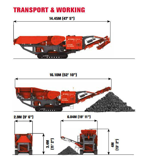 Terex Finlay J-1170 je kompakten in zmogljiv čeljustni drobilec. Duša stroja je robustna hidrostatična pogonska čeljust Terex, ki zagotavlja visoko zmogljivost z visokim razmerjem prenosa. Prilagodljiva čelna komora se lahko s pomočjo hidravlike nastavi posebej za uporabo v kamnolomih ali za obdelavo ruševin. Posebnost J-1170 stroja je spremenljiva hitrost za težja opravila ter vgrajen presejalnik, ki zagotavlja odlično zmogljivost proizvodnje v kamnolomih, rudnikih ter pri recikliranju in obdelavi ruševin. Poudariti je potrebno opcijske funkcije, ki vključujejo podajalnik spremenljive hitrosti ter neodvisni sistem presejanja. Transportna teža 48,9 ton in kompaktne dimenzije modela J-1170 zagotavljajo nižje stroške prevoza med gradbišči.