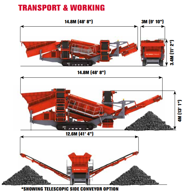 Visoko zmogljivi Terex Finlay 883+ je zasnovan tako, da deluje kot enota po drobljenju ali pa lahko deluje kot sejalnica. Uporabi se lahko na področju obdelave raznih kamnin, rudarske gradnje in ruševin, recikliranja, peska, gramoza, premoga in raznih agregatov. Stroj ima zmogljivost za obdelavo s hitrostjo do 600 ton na uro in se lahko napolni z gosenicami, mobilnimi drobilniki,… Zdaj na voljo s tehnologijo dvojne moči. Električni motorji na vozilu omogočajo fleksibilnost pri vožnji iz zunanjega napajanja ali standardnega motorja na vozilu.